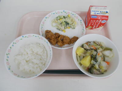 11月14日の献立:ごはん、のっぺい汁、さばの竜田揚げ、卯の花炒り、牛乳