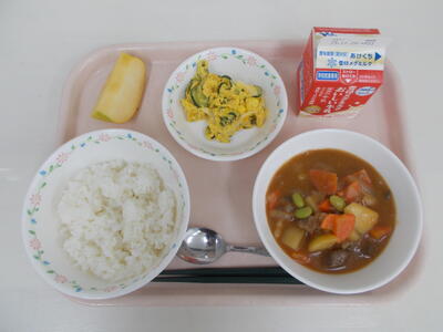 11月17日の献立:ごはん、ビーフシチュー、かぼちゃとおからのサラダ、りんご(シナノゴールド)、牛乳