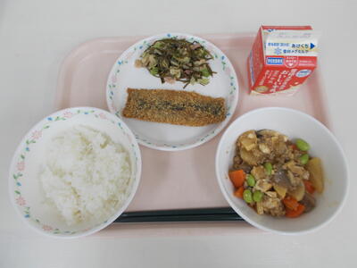 11月18日の献立:ごはん、大根のピリ辛そぼろ煮、さんまのフライ、昆布サラダ、牛乳