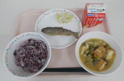 :紫黒米ごはん、味噌汁、あまごの唐揚げ、甘酢和え、牛乳