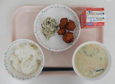 11月20日の献立:ごはん、白花豆のクリームスープ、チキンナゲット、大根サラダ、牛乳