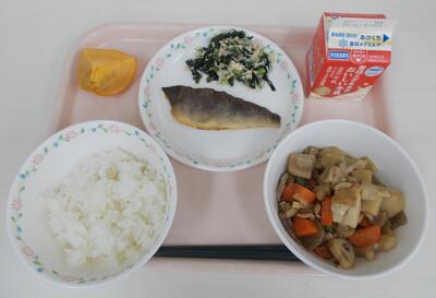 11月21日の献立(和食の日):ごはん、筑前煮、焼きほっけ、酢味噌和え、柿、牛乳