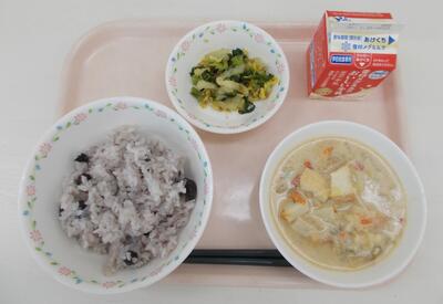 1月19日の献立【食育の日献立:宍粟市産の日】:黒豆ごはん(多め)、みそ汁、白菜のおひたし、牛乳