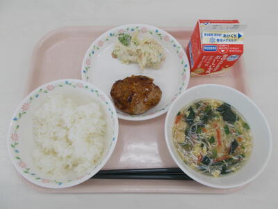 ちくさの舞ごはん、にゅうめん、椎茸と豆腐のハンバーグ、ポテトサラダ、牛乳