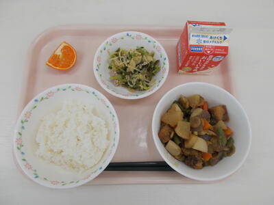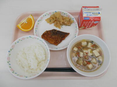 1月21日の献立:ごはん、ぶりと根菜の煮物、豆苗と豚肉の中華和え、みはや(みかん)、牛乳