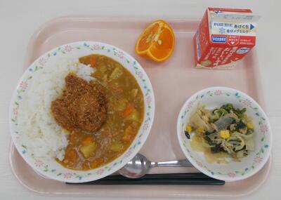 3月9日の献立:カツカレーライス、こんにゃくサラダ、せとか、牛乳