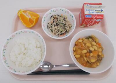 3月10日の献立:ごはん、ポークビーンズ、切り干し大根のサラダ、でこぽん、牛乳