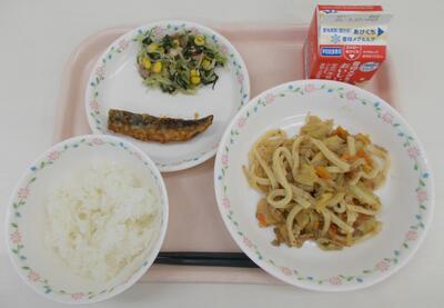3月11日の献立:減量ごはん、焼きうどん、いわしの蒲焼き、五色和え、牛乳