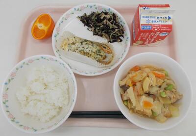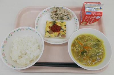 3月12日の献立:ごはん、ビーフンスープ、豆腐オムレツ、れんこんサラダ、牛乳