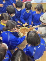 4年生は、1年前に仕込んだ味噌を開く待ちに待った時間でした。蓋を開けると同時に味噌のおいしそうな香りが部屋中に広がりました。少し食べ、残りは家族へのお土産です。宝物を抱えているかのように味噌を大切に持つ4年生でした。