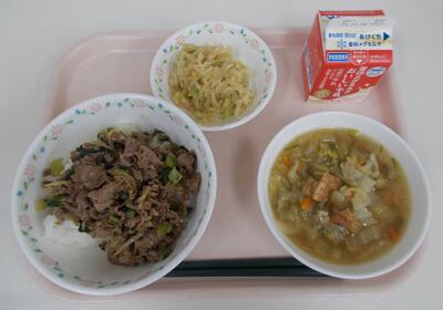 12月12日の献立(ふるさと献立・兵庫県産の日):焼き肉丼、白菜スープ、大根ナムル、牛乳