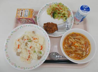 12月3日の献立:しょうがごはん(少なめ)、ちゃんこうどん、豆あじの唐揚げ、卯の花炒り、牛乳
