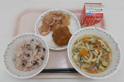 1月15日の献立:小豆ごはん、けんちんうどん、みそカツ、いか大根、牛乳