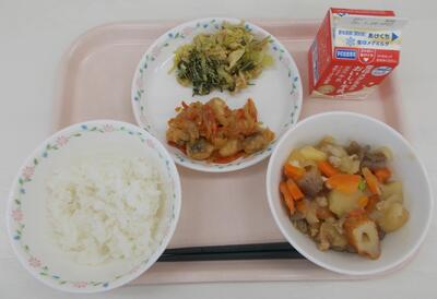 2月6日の献立:ごはん、芋煮、揚げカレイ、水菜の酢味噌和え、牛乳