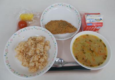 1月28日の献立【コロンビア共和国料理】レチョナ(炊き込みごはん)、アヒアコ(スープ)、しいらのフライ、ミディトマト、パイナップル、牛乳