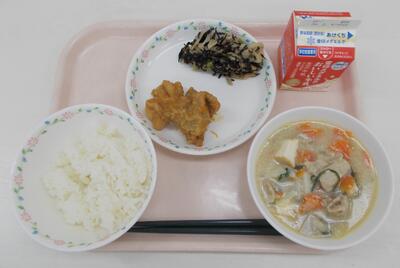 1月26日の献立【ふるさと献立(兵庫県産の日)】:ごはん、粕汁、えいのゆずか揚げ、ひじきとれんこんのごま酢和え、牛乳