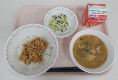 2月17日の献立【ふるさと献立:兵庫県産の日】:鶏そぼろ丼、粕汁、もち麦麺のサラダ、牛乳