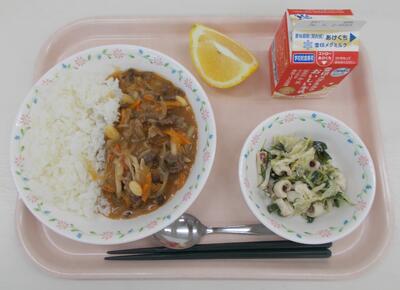 2月5日の献立:もみじカレーライス、れんこんサラダ、フルーツミックス、牛乳