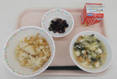 2月19日の献立【食育の日献立:宍粟市産の日】大根ごはん(多め)、みそ汁、黒豆の甘煮、牛乳