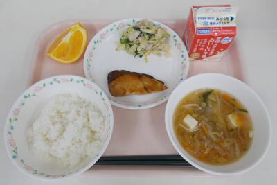 2月20日の献立:ごはん、野菜椀、ぶりの照り焼き、ゆで豚マヨぽんサラダ、ネーブルオレンジ、牛乳