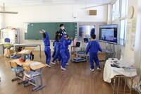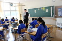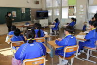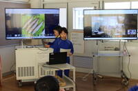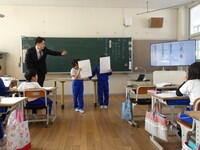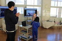 次に、校舎内に場所を変えて、「かくれんぼ」をしました。ハンターの6年生や先生に見つからないように、掃除道具のロッカーやカーテンの後ろ。エレクトーンの隙間や教材教具の後ろなど、いろいろ考えて5分間見つからないように、じっと隠れていました。