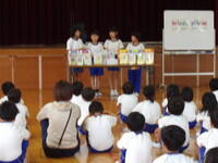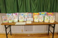 寄付していただいた本の中から、図書委員会の児童たちが、「10分間で読める伝記」の各学年版を紹介してくれました。学級文庫に置いたり、図書室に置いたりして、みんなで大切に読ませていただきます。